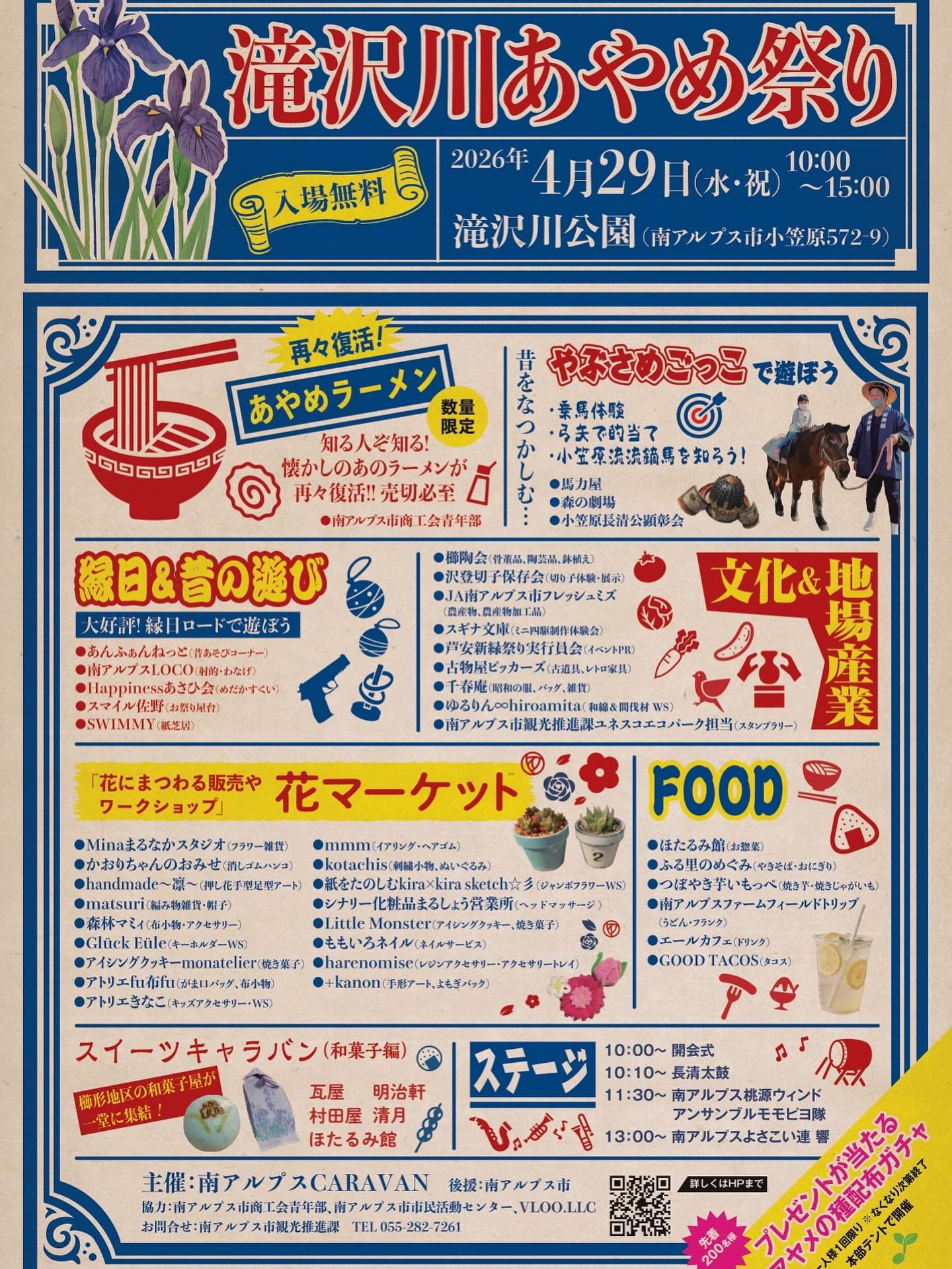 本日4/29(祝)は 南アルプス市滝沢川あやめ祭り! 運営メンバーとして関わっておりまして、 なとり屋食堂お休みとなります🙇♂️